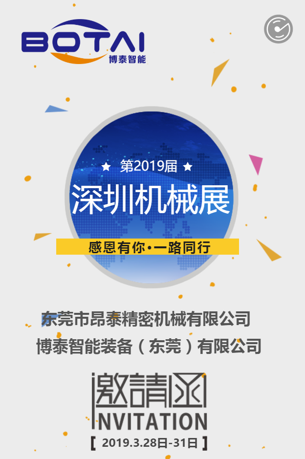 第20届深圳国际机械制造工业展览会 地址:中国.深圳会展中心 展位:8号馆 8C49 现诚邀阁下于2019年3月28日至31日莅临我司展台 参观感谢您的支持 米兰milan智能装备(东莞)有限公司